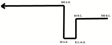 The B.C. years emerge from a misty patch to my right - they go back endlessly past some invisible horizon, but from about the time of Moses is when I can see the beginning of the line. They go in a straight line to the left, until 60 BC, when they break left and go straight down until the BC/AD turnover, where they resume their journey to the left. Upon reaching AD 30-ish, the line turns right and goes straight up through 300 AD, when it breaks left again and continues on in an unbroken line until the Renaissance.