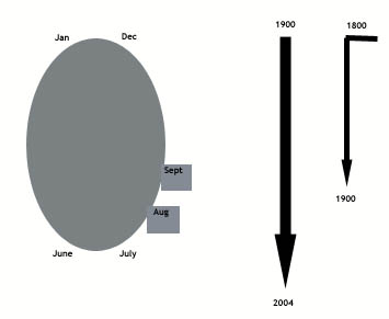 As a former History major, I tend to look at things from a... historical perspective, I suppose. That's probably common and obvious. But recently I realized that I look at history, at months and years and centuries, from a VISUAL perspective. For me, time goes in different directions, turns corners, runs perpendicular or parallel (depending on the century) and in the course of a year, goes in a circle.